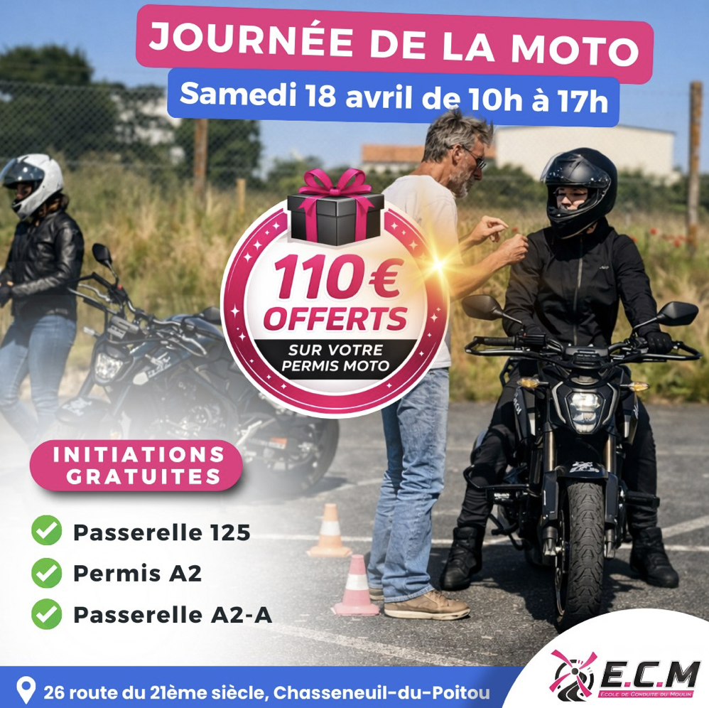 Initiations gratuites20 .03.2026Le 18 avril, 26 route du 21ème siècle à Chassenueil-du-Poitou initiation moto avec L'école de conduite du moulin. Lire la suite ...